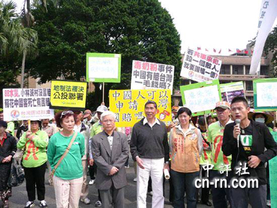 3日中午民进党“立委”蔡同荣等人赴台“行政院”,反对给予在台失踪和罹难的大陆游客所谓的“国家赔偿”。20多名绿营支持者手持“台湾人不是中国人”、“废除两岸人民条例”等标语抗议。