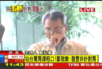 中国台湾网11月8日消息 据台湾TVBS电视台报道,台湾著名主持人、亲绿名嘴郑弘仪7日晚在参加绿营晚会时狂爆粗口骂马英九,引起岛内轩然大波。在蓝营痛批、绿营呼吁其知错道歉的“围剿”下,郑弘仪8日上午召开记者会,正式向马英九道歉。