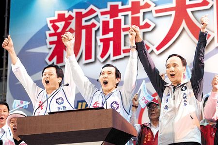 马英九14日晚间出席国民党新北市长候选人朱立伦(右)在新庄的造势晚会,肯定台北县长周锡玮(左)4年的政绩,诉求选民让国民党继续执政。 来源:台湾《中国时报》