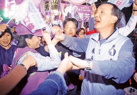 国民党新北市候选人朱立伦15日晚在板桥举办造势晚会,进场时受到支持群众热情包围,朱立伦边走边与民众握手致意。 (来源:台湾《中国时报》)