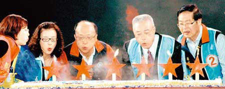 中国台湾网11月21日消息 据台湾《中国时报》报道,国民党116岁生日晚会,昨晚特地移师胡志强竞选总部举行,吸引近万民众挤爆会场。国民党主席马英九、荣誉主席连战、副主席江丙坤、台当局“行政院长”吴敦义、马英九办公室秘书长廖了以、前台中市长林柏榕、彰化县长卓伯源、南投县长李朝卿等国民党重量级人士到场。报道称,国民党A咖(大佬)昨晚在台中大会师,为胡志强冲人气。