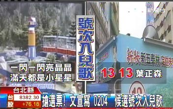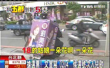 据台湾TVBS报道,台湾“五都”选举进入倒数计时,候选人纷纷出奇招,开着宣传车穿梭大街小巷,卖力向选民宣传,有人把候选号码结合耳熟能详儿歌。
