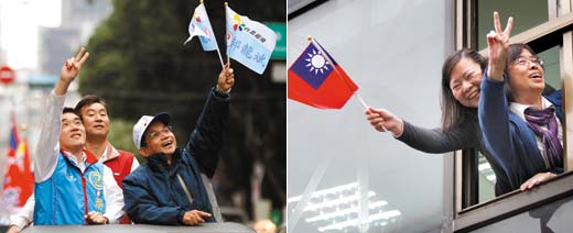 选举倒数3天,台北市长候选人郝龙斌昨天在中正区进行“车队扫街”,支持者从高楼窗户探头出来为他加油打气。记者陈柏亨/摄影 图片来源:台湾《联合报》