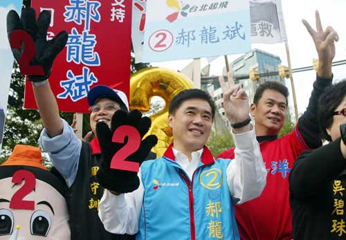 “五都”选举倒数1天,中国国民党台北市长候选人郝龙斌(前中)26日在士林区剑潭路、中山北路交叉口拜票,把握最后时间向市民请托。 图片来源:“中央社”
