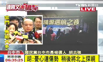胡志强担心连胜文安危,彻夜难眠。 来源:台湾TVBS电视台