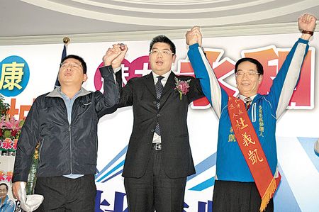 林正伟案发前曾打了两通电话给陈鸿源的竞选总干事、绰号“黑狗”的永和民众服务社理事长杜义凯(右),但杜都未接。图为去年3月25日,参选永和市长的杜义凯竞选总部成立,连胜文(中)与陈鸿源(左)为他站台。来源:台湾《中国时报》