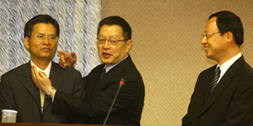 台湾“立法院内政委员会”6日邀请内政部长江宜桦(右)专题报告“1126枪击案”,会中“警政署长”王卓钧(中)说明国民党荣誉主席连战的儿子连胜文中枪经过。图片来源:台湾“中央社”