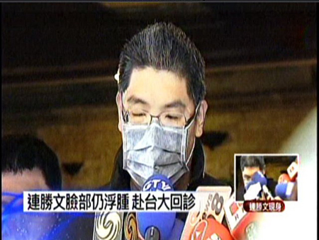 中国台湾网12月10日消息 据台湾“今日新闻网”报道,国民党荣誉主席连战之子连胜文,在被枪击第15天、自行出院第5天后首度露面。连胜文10日上午10时13分步出居住的一品大厦,双眼明显浮肿,脚步蹒跚。连胜文现身后,许多媒体将麦克风推到他面前,急得妻子蔡依珊在一旁提醒“不要碰到伤口”,担心之情溢于言表。