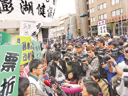 马英九视察澎湖,专程前往开台天后宫祈福参拜,绿营群众集结陈情抗议。