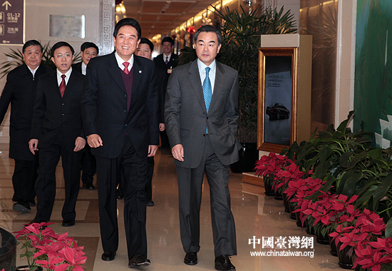 12月20日上午,中共中央台办、国务院台办主任王毅在首都机场为即将启程赴台北参加第六次两会领导人会谈的海协会会长陈云林送行。(中国台湾网 田云鹏 摄)
