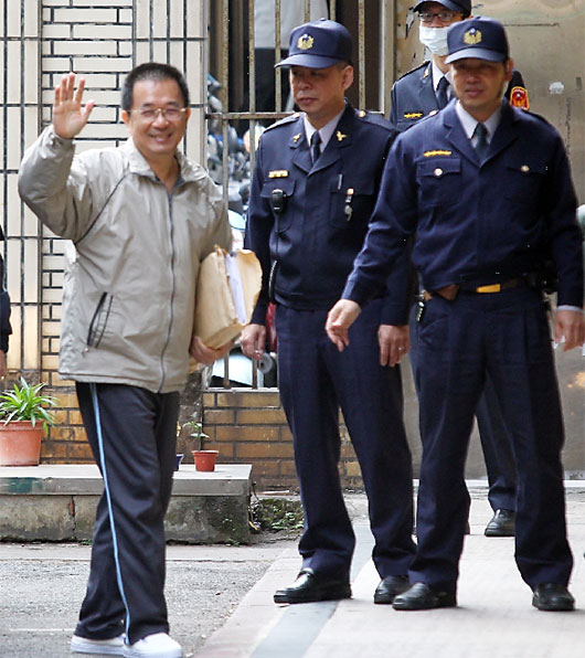 陈水扁(左)入监后今日上午首度被提讯出庭,陈水扁穿着监狱提供的出庭服进入台北高等法院时还向采访的媒体挥挥手。图片来源:台湾联合晚报