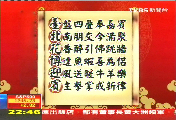 中国台湾网12月22日消息 据台湾TVBS电视台报道,两岸两会领导人第六次会谈21日在台北举行,20日晚海基会在台北圆山饭店宴请包括海协会会长陈云林等海协会相关人士。晚宴准备的菜色都是具有台湾特色的佳肴,最特别的是由12道菜名组成一首藏头诗,将“台北花博迎宾”的字眼镶嵌在里面。