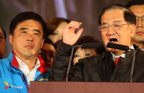 国民党荣誉主席连战(右)11月26日晚间出席“我爱台北我的家─郝龙斌(左)选前之夜”活动,提到儿子连胜文被枪击,哽咽谴责暴力行为。
