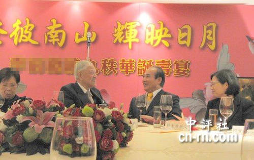 据中评社报道,李登辉昨晚在300多名宾客的祝福下欢度90大寿,包括“立法院长”王金平、前“考试院长”许水德、民进党主席蔡英文、亲民党主席宋楚瑜、前民进党主席苏贞昌、谢长廷、高雄市长陈菊、大台南市长赖清德、前花莲县长谢深山、前“国策顾问”金美龄、前台南市长苏南成等蓝绿政要都出席,席开近30桌。