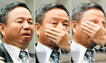 杨志良出席记者会时显得有些疲倦,不时强忍哈欠,并用力的以手抹脸提神。 来源:台湾《联合晚报》