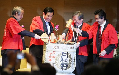 据台湾“中央社”6日的报道,马英九6日晚间出席2011年台北日本人会、台北市日本工商会新年会,除了致词外,也参加日本“开镜”仪式。马英九身穿日本传统红色服装,与日本人士以木槌打击清酒桶,并和现场来宾举杯共祝新年愉快。