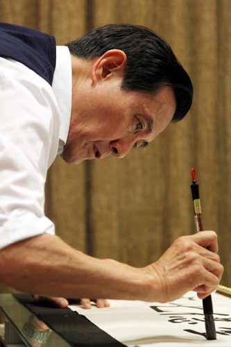 为迎接兔年,马英九官邸11日公布贺岁春联。马英九(图)认真执笔练习,用毛笔替兔年贺岁春联。