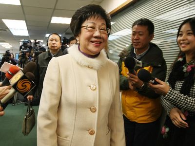 吕秀莲顶着全新设计的发型,带着上百位民进党党代表联署书,到民进党中执会,率领 “党员派”,决战民进党中央属意的“全民调派”。图片来源:台湾“中央社”