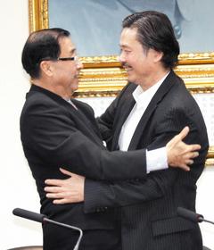 国民党即将卸任秘书长的金溥聪(右)和将接任党秘书长的廖了以(左),两人在记者会拥抱两次。图片来源:台湾联合报