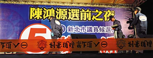 连胜文在陈鸿源的造势晚会站台助选,被“马面”林正伟朝头部开枪,图为案发后,警方封锁现场采证。图片来源:台湾《联合报》