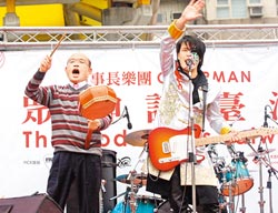 苏贞昌(左)23日参加董事长乐团专辑签唱会,现场当起一日团员,拿乐器卖力表演。图片来源:台湾《中国时报》