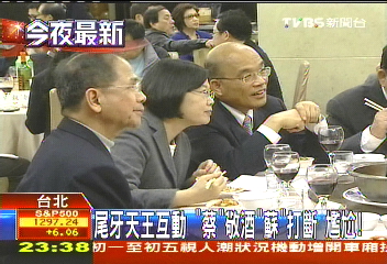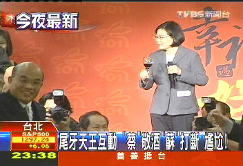 中国台湾网1月27日消息 据台湾TVBS电视台报道,民进党一年一度年终尾牙盛宴昨(26)晚举行,一场本来欢庆的宴席却因力拼2012“大选”出线的苏贞昌、蔡英文显得颇为尴尬。报道称,2人尾牙场上虽没刻意隔开,并难得互动一搭一唱,有说有笑,但就在蔡英文开场谈话结束,准备敬酒时,苏贞昌突然到场,打断台上的蔡英文,蔡英文的表情颇为尴尬。