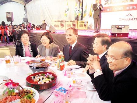 民进党主席蔡英文(左二)、前台湾地区副领导人吕秀莲(左一)及前陈水扁当局“行政院长”苏贞昌(右起)、谢长廷、游锡堃,7日在宜兰运动公园聚首,一同喝春酒。 来源:台湾《中国时报》