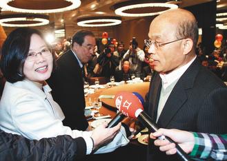 蔡英文离开春酒餐会时跟苏贞昌握手致意,苏贞昌还示意“握久一点,让媒体拍个够!”