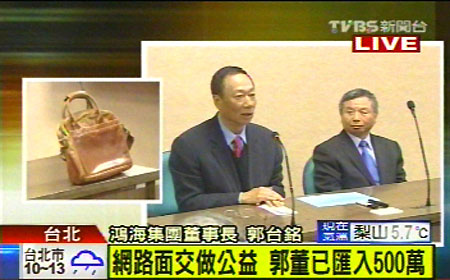 据台湾TVBS电视台消息,台湾鸿海集团董事长郭台铭以500万元(新台币,下同)标下了前“卫生署长”杨志良的公事包,两人今日相约面交。杨志良表示,他除了感谢郭台铭的善心之外,也对许多热情的网友表示感谢,对网友们的出价竞标相当感动。