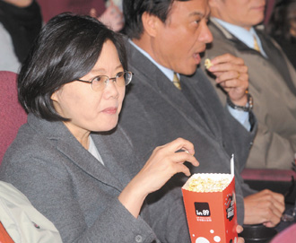 民进党主席蔡英文(左)昨天观看电影“鸡排英雄”。对于吕秀莲炮打党中央,蔡英文说,已责成秘书长苏嘉全(右)拜会吕,“主席个人的意见不是最关键的”。
