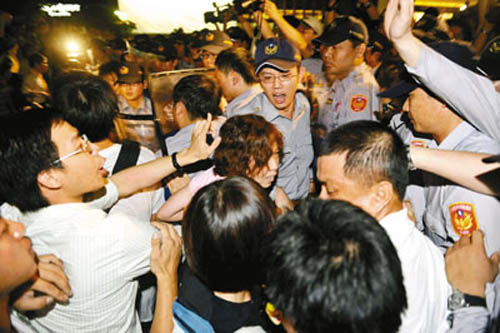 资料图:2008年11月,陈云林赴台,民进党煽动绿营民众闹事数百人用石块、棍棒攻击警察,深夜还有人掷汽油弹形成火海。7日凌晨,镇暴喷水车朝现场喷水柱强制驱离人群。这场流血事件,堪称台湾近十年来最严重的警民冲突。