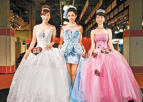 李婉钰(中)穿上爆乳婚纱抢镜。 来源:台湾《苹果日报》