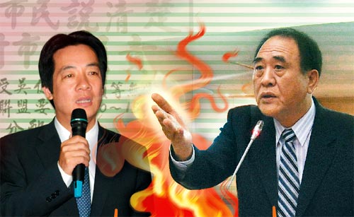 因建设工程款争议,台南市政府与议会对立。市长赖清德(左)表示议员要工程款,越权造成浪费。市议员吴健保(右)则表示,市长如此说法,无异是向议员开战。图片来源:台湾《联合报》
