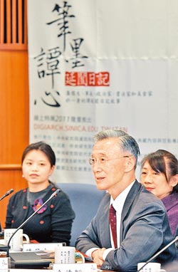 台湾“中研院”数码典藏“笔墨谭心-延闿日记网站”昨日举行成果发表会,民初才子谭延闿的谭家美食,是很多民初名人的最爱。谭延闿外孙、前台“监察院长”陈履安(右)出席发表会。