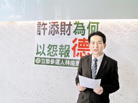 林俊宪昨天公开以大字报“以怨报德”的强烈字眼批评许添财,他说,赖清德在处理吴健保议员等人的要求,连“行政院长”吴敦义、民进党主席蔡英文等人都表达相挺之意,想不到只有许添财落井下石,公开嘲讽。