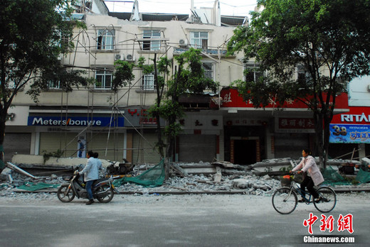 图为灾区民众清晨从倒塌的房屋前经过。中新社发 任东 摄