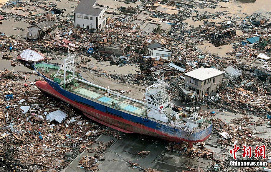 北京时间3月11日13点46分,日本本州岛附近海域发生里氏8.9级地震,震中位于宫城县以东太平洋海域,震源深度10公里,东京有强烈震感。图为3月12日,日本宫城县沿海地区的船只被地震所引起的海啸冲上海岸。