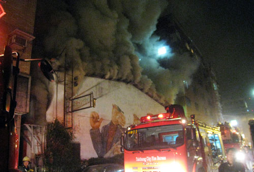 台中市中兴街知名的夜店阿拉(ALA)6日凌晨发生大火意外,火场冒出阵阵浓烟,部分顾客逃生不及,造成9死12伤惨剧。 图片来源:“中央社”