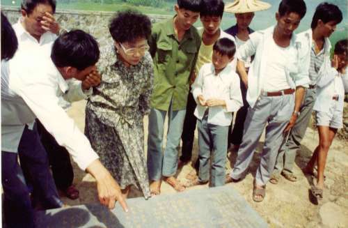 一九九○年台湾开放居民到大陆探亲的第二年,时任台湾桃园县县长的吕秀莲难抑思乡之情,以妇女会的名义,捷足先登,回到田中村祭祖寻根,受到了乡亲们的热情欢迎和接待。当时,吕秀莲曾抚摸龙潭楼内一口八米深的古井,深情地说:“我要喝一口故乡的井水,这叫饮水思源。”图为吕秀莲在大陆祖祠察看两岸吕氏宗亲往来的记事碑(资料照片)
