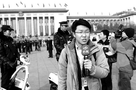 3月5日,台湾中视记者在天安门广场报道新型警察巡逻车。图片来源:国际在线网站