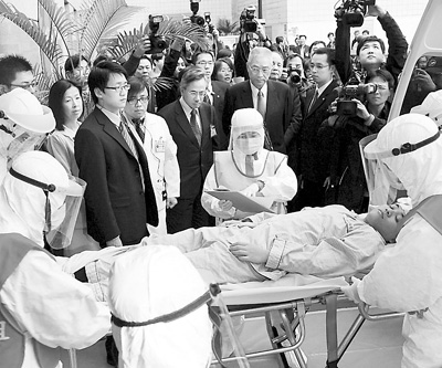 台湾卫生主管部门日前在台北举行“疑似辐射伤害病患紧急医疗处置”示范演习。 符永康摄