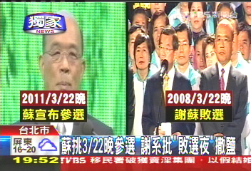 苏贞昌3月22日晚宣布参加民进党2012“大选”党内初选,此日正是2008年台湾地区领导人选举谢苏2人败选日。图片来源:台湾TVBS电视台
