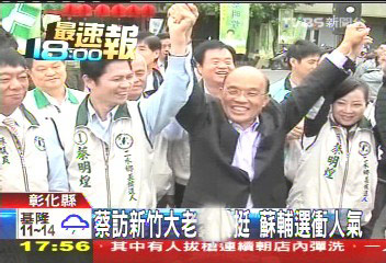无独有偶,苏贞昌今日南下彰化,为二林乡长候选人扫街拜票,也替自己广结善缘冲出人气。多名彰化议员、“立委”参选人都全程陪伴,大批支持者在一旁高喊“冻蒜(当选)”。