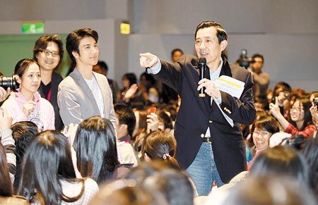 马英九(右)与歌手王力宏(右二)29日在台湾清华大学对谈。结束后2人走到台下与学生互动,引起热烈回响。来源:台湾《中国时报》