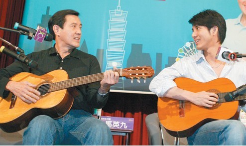 图为2007年马英九和王力宏在“两世代偶像对谈”会上,合弹吉他共唱英文歌曲。