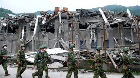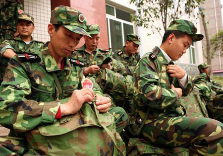大批武警部队士兵不眠不休,在灾区奔波。