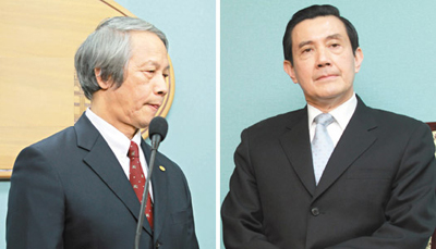 赖浩敏(左)向“大法官”审荐小组推荐邵燕玲,自认思虑不周,1日向马英九、萧万长及岛内民众致歉。马英九(右)亲自出面道歉,神情凝重。 来源:台湾《联合报》