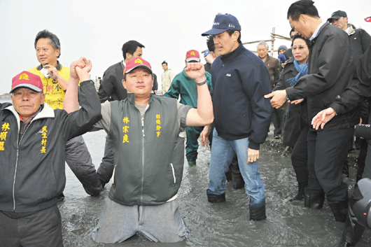 中国台湾网4月5日消息 据台湾《联合报》报道,台湾地区领导人马英九与台当局“内政部长”江宜桦等人,4日由彰化县环保联盟成员带领,坐着采蚵车前往大城湿地巡视;海滩前,一群反“国光石化”的民众举起“湿地石化无法并存”、“国光石化撤案,湿地才有未来”的布条,甚至有人跪在海滩中,向马英九宣示保护湿地的决心。