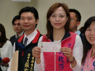 图为阙枚莎出示马英九领表缴交的200万元新台币支票。图片来源:台湾“中广新闻网”。