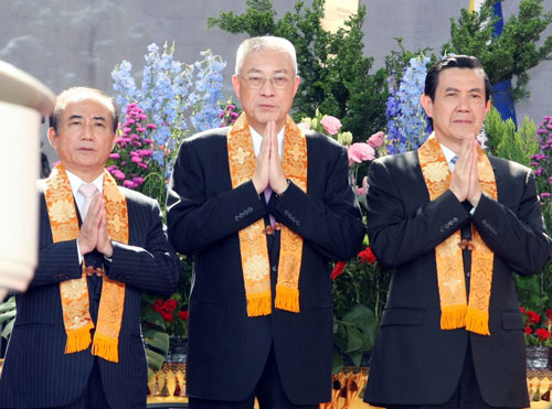 马英九(右)、“行政院长”吴敦义(中)、“立法院长”王金平(左)8日出席浴佛祈福大会,与信众一同祈福。 图片来源:“中央社”